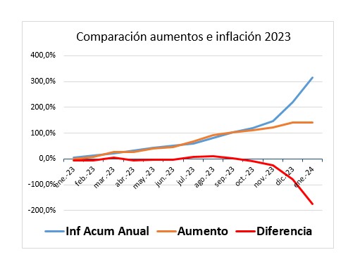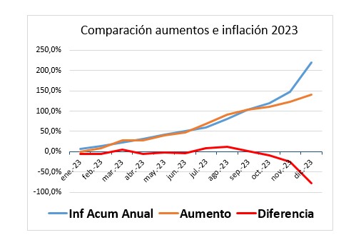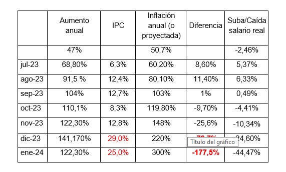 Si no logramos modificar el escenario económico, la distribución de la riqueza, los resultados económicos previstos, con haberes de enero estaremos perdiendo casi la mitad de nuestro salario. Si en enero de 2023 nos alcanzaba para determinado nivel de adquisición de bienes y servicios, en enero de 2024 sólo podremos adquirir la mitad de esos bienes y servicios con nuestro ingreso salarial.