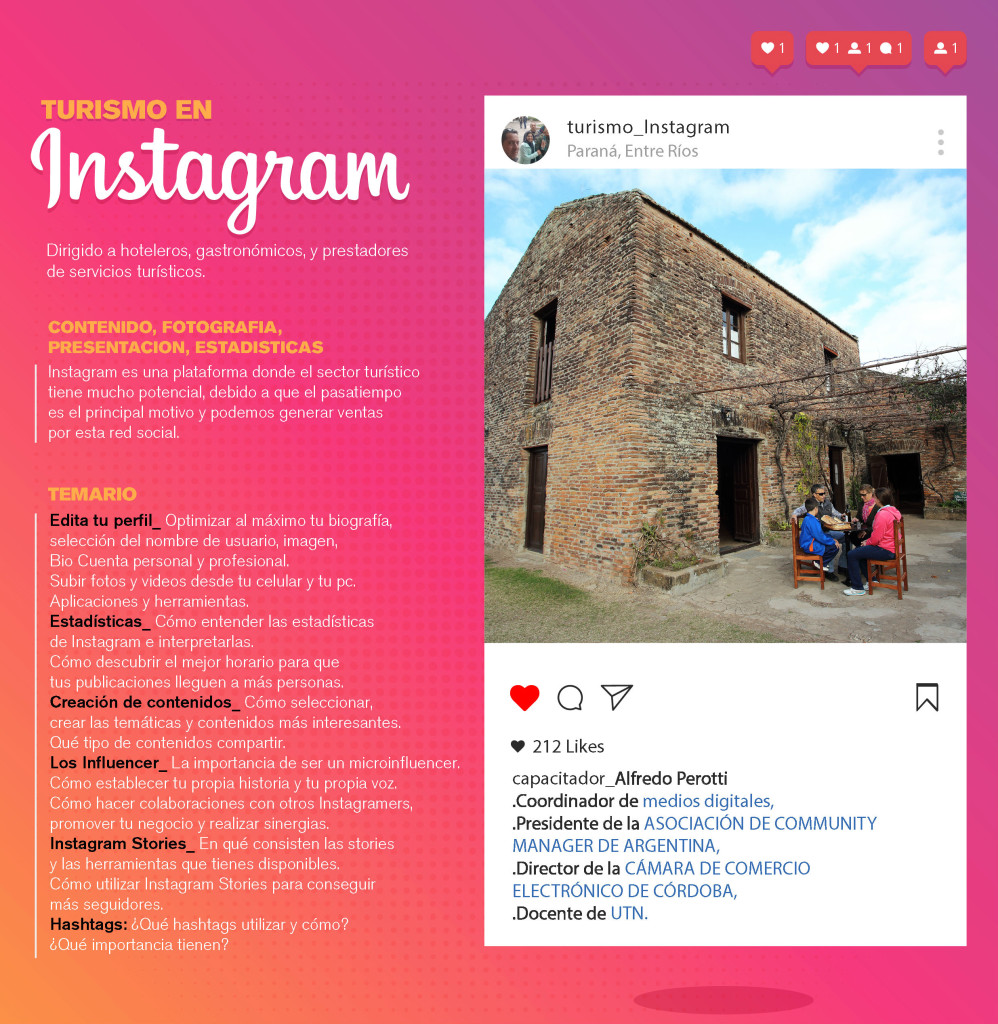 La Capacitación «El turismo en Instagram” será dictada por el coordinador de medios digitales Alfredo Perotti y se realizará este lunes 2 de septiembre, de 9 a 13, en el Centro de Convenciones Concordia, ubicado en San Lorenzo (oeste) 101.