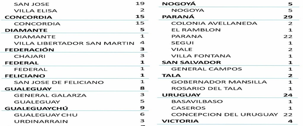 Departamento Colón 26, Departamento Concordia 15, Departamento Diamante 5, Departamento Federación 3 , Departamento Federal 1, Departamento Feliciano 1, Departamento Gualeguay 8, Departamento Gualeguaychú 9, Departamento Islas del Ibicuy 7, Departamento La Paz 1, Departamento Nogoyá , Departamento Paraná 29, Departamento San Salvador 1, Departamento Tala 2, Departamento Uruguay 24, Departamento Victoria 4. De ese modo, en la provincia son 49.255 los casos confirmados.
