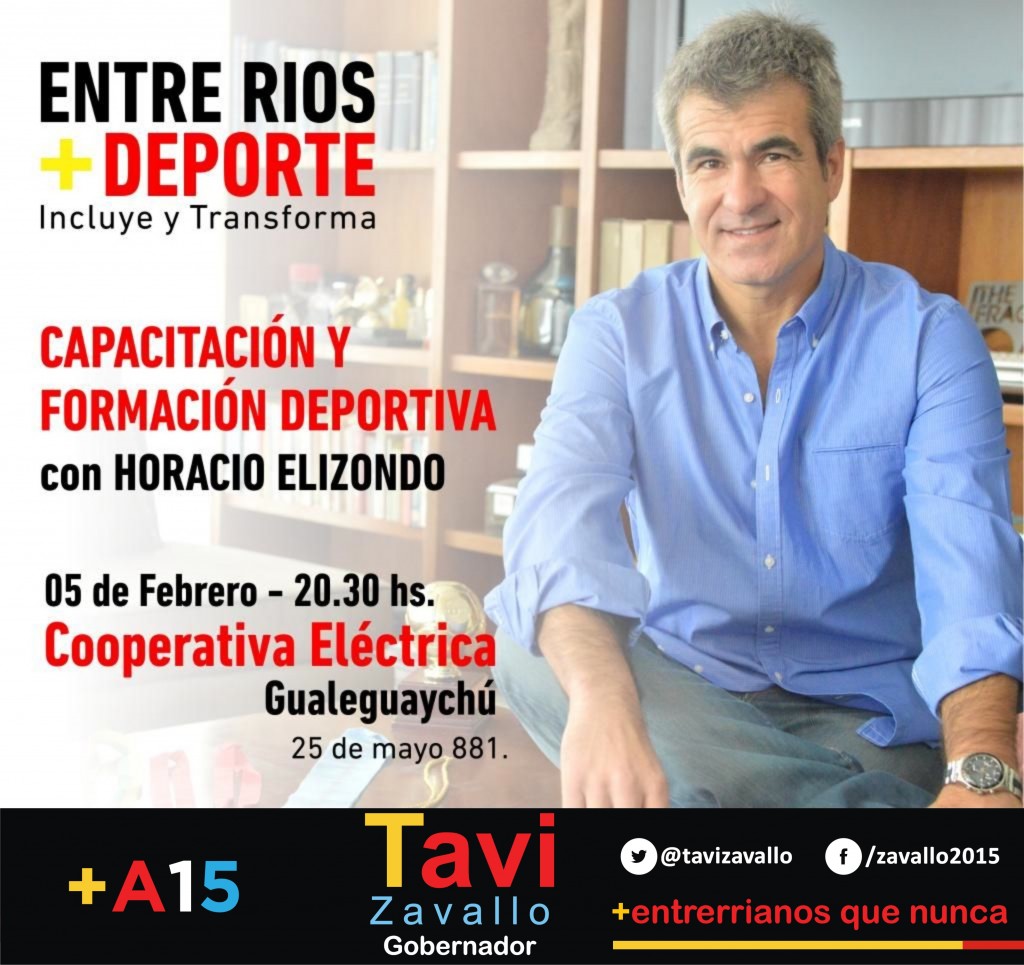 El precandidato a gobernador del Frente Renovador, Gustavo ‘Tavi’ Zavallo, confirmó la visita para este 5 de febrero del ex árbitro mundialista, Horacio Elizondo. Será en el marco del programa del Frente Renovador Entre Ríos +Deporte, que promociona actividades recreativas y de formación, con el fin de generar una plataforma de gobierno “que apunte a incluir a entrerrianos de todas las edades en el deporte social y profesional”.
