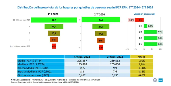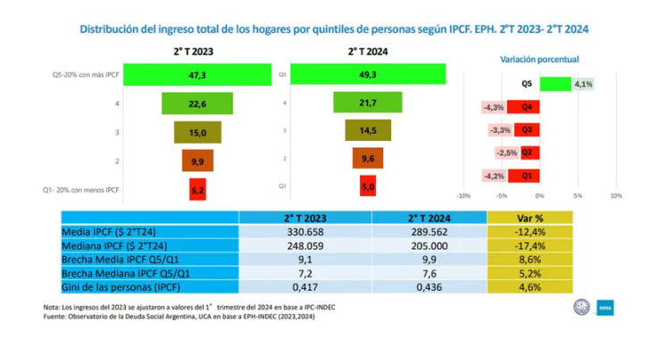 Para graficar el corrimiento en la pirámide económica, el informe indica que durante el segundo trimestre del 2024, el 20% de la población de menores ingresos se apropia de apenas el 5% de los recursos monetarios totales. En tanto que el 20% de mayores ingresos concentra el 49,3%.