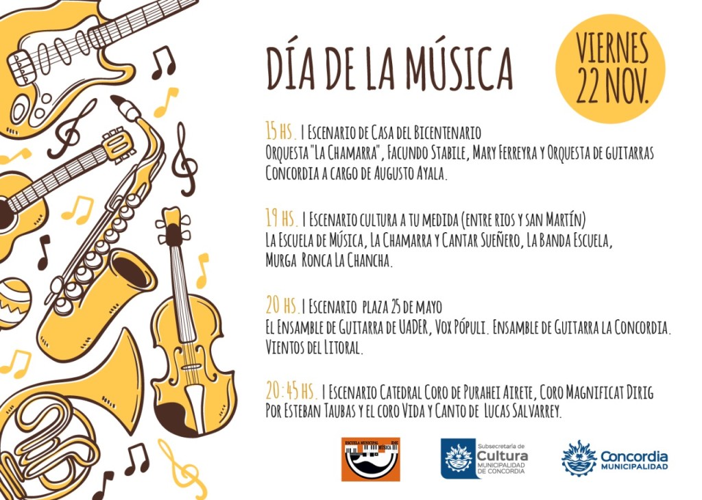 «La música es un idioma universal y está presente en todos los eventos que se organizan desde la Municipalidad, y siempre buscamos darle la importancia que tiene», resaltó Omar Kueider, director de Cultura de la Municipalidad. «La música va a estar presente todo el fin de semana, es protagonista todo el fin de semana en Concordia, con muchas opciones, para que la gente pueda disfrutar», resaltó, en referencia al evento Entre Pintas que se realizará el sábado en el predio ferial del Centro de Convenciones, el recital por el décimo aniversario de Fundación Magister en la sala del Centro de Convenciones, el Encuentro de Folclore en el anfiteatro de la Costanera el día sábado, y la semifinal del Certamen Búsqueda de Talentos el día domingo también en la Costanera.