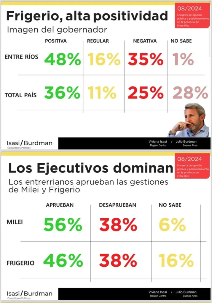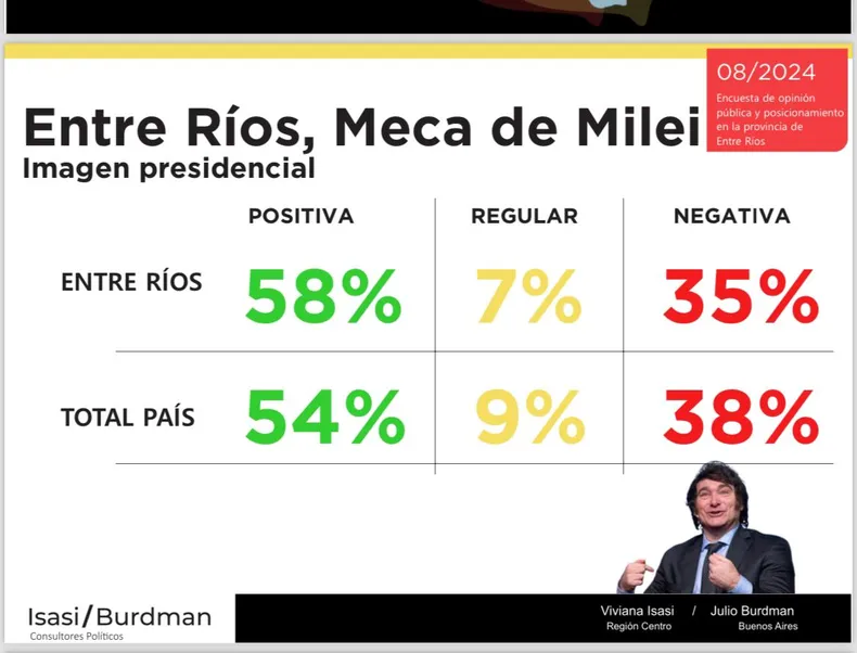 La encuesta pone de manifiesto, principalmente, un fenómeno notable en Entre Ríos, donde la figura de Javier Milei ha logrado consolidar una base de apoyo fuerte, superando incluso la media nacional en la provincia. «A nosotros esto nos pareció un dato muy particular en el escenario nacional, acá Milei está con cuatro puntos arriba del promedio nacional, o sea, la provincia de Entre Ríos está hecha en una provincia “mileimacrista” podríamos decir, según estos niveles de aprobación a las gestiones de Mieli y Frigerio», definió Isasi.