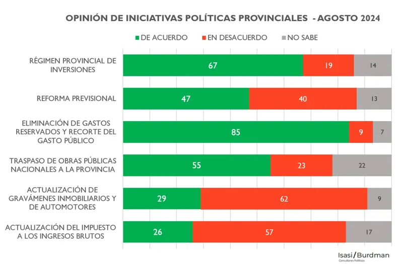 El estudio también se enfoca en las medidas impulsadas por la gestión provincial en sus primeros meses de gestión, indicando que la austeridad y transparencia en los gastos es la variable mejor considerada, mientras que la cuestión impositiva para ser el factor que menos «simpatía» despierta en la percepción pública.