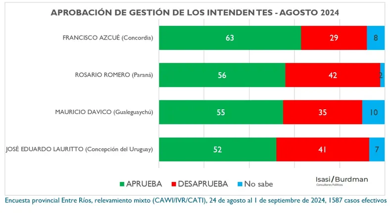 Un reciente sondeo realizado por la consultora Isasi / Burdman en Entre Ríos revela una significativa aprobación a las gestiones tanto del presidente Javier Milei como del gobernador Rogelio Frigerio, con un 58% y un 46% respectivamente. Asimismo, destaca la sólida evaluación de los intendentes de las principales ciudades de la provincia, entre los que sobresale Francisco Azcué, Intendente de Concordia, con un 62% de aprobación.