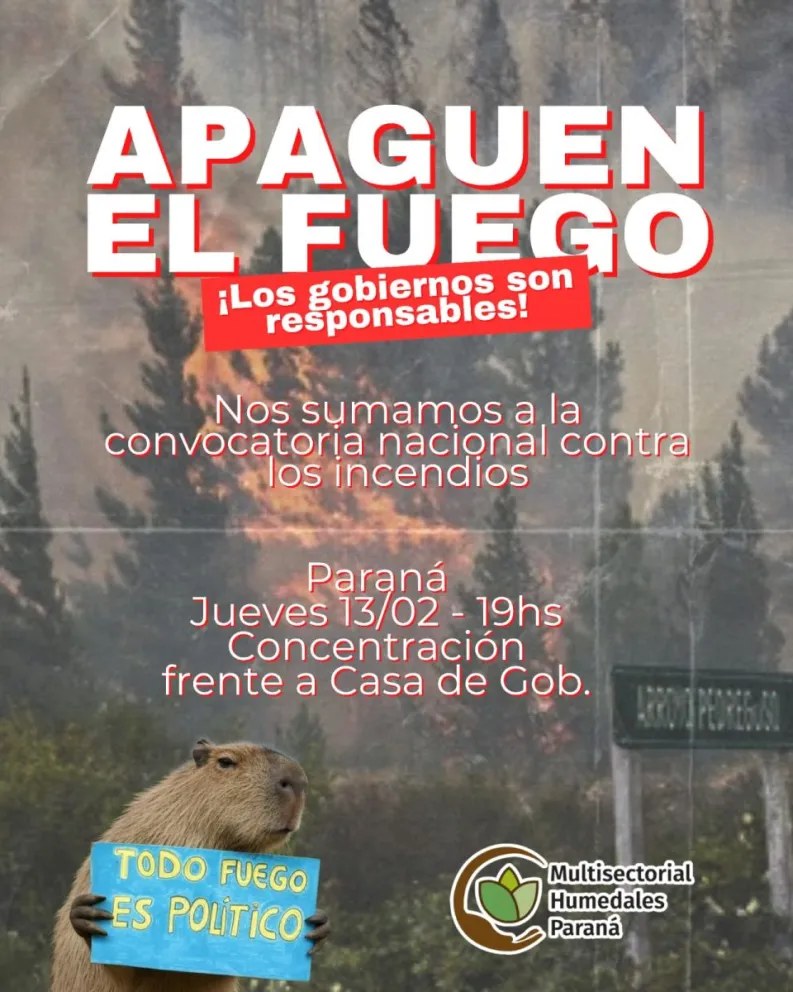 En Paraná, se realizará una concentración frente a Casa de Gobierno desde las 19. Allí también se pedirá también que la ministra Patricia Bullrich “cumpla” su labor como titular del Manejo del Fuego. “Está más preocupada en reprimir y desalojar a quienes protegen los territorios”