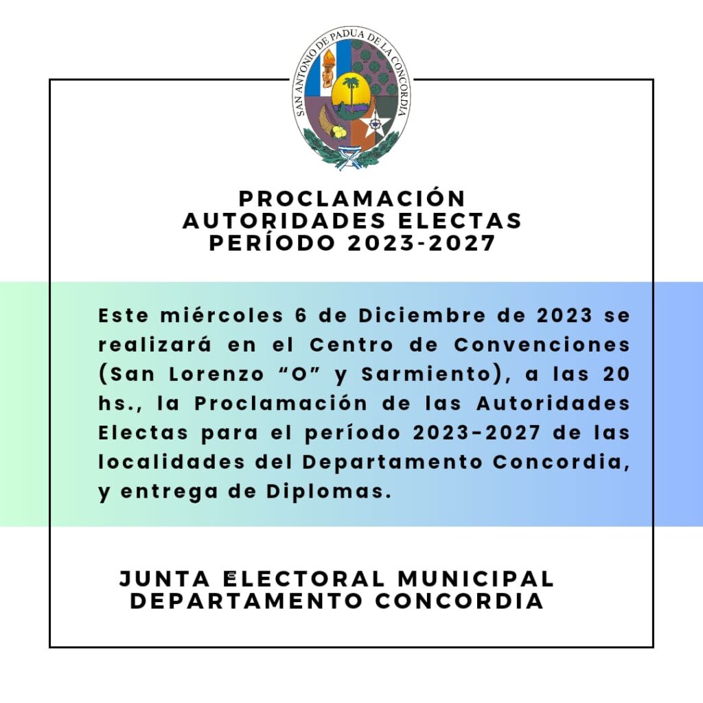 Este miércoles 6 de diciembre a las 20 hs en el Centro de Convenciones, la Junta Electoral Municipal del Departamento Concordia realizará la proclamación de las autoridades electas y entrega de Diplomas a los Vocales de Juntas de Gobierno, Concejales, Viceintendentes e Intendentes electos del Departamento Concordia para el período 2023-2027. En tanto el jueves a las 19.30 hs en el recinto del Concejo Deliberante, realizarán la Jura y asumirán los integrantes del cuerpo deliberativo local.