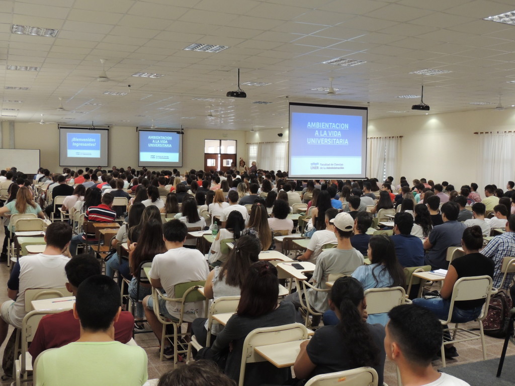 Ante el Aula Magna totalmente repleta de ingresantes a las carreras de Contador Público, Licenciatura en Ciencias de la Administración, Licenciatura en Sistemas, Programador en Sistemas, Licenciatura en Turismo, Tecnicatura en Turismo y Profesorado en Portugués, el decano de la Facultad de Ciencias de la Administración, Raúl Mangia pronunció su discurso de bienvenida a quienes inician la vida universitaria en esta Unidad Académica