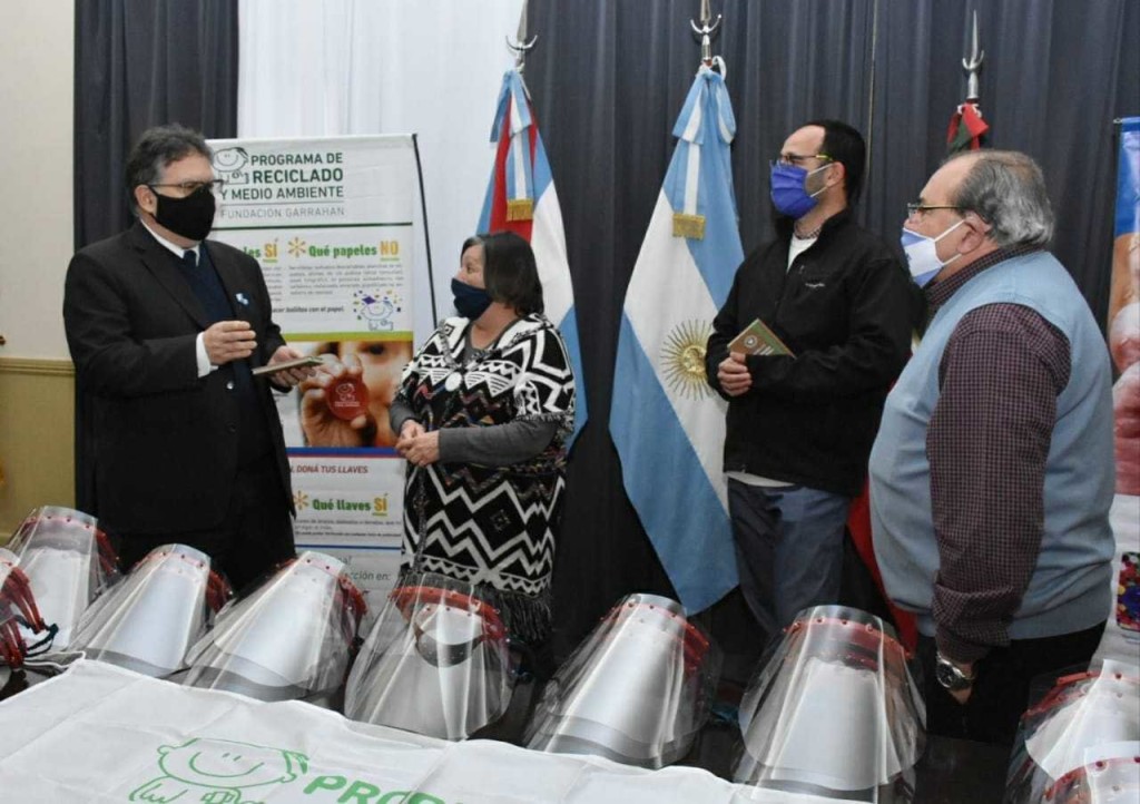 Elaboradas con tapitas de gaseosas recicladas, la institución hizo entrega a diferentes organismos y también a la Municipalidad de máscaras faciales de protección, las que serán destinadas al personal que realiza controles en los accesos a la ciudad. El intendente Alfredo Francolini destacó el gesto solidario y la tarea de concientización ambiental que la Fundación realiza.