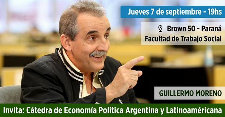 Guillermo Moreno, quien fue Secretario de Comercio Interior durante la gestión kirchnerista, estará el jueves en Paraná: A las 19 brindará una charla debate en la Facultad de Trabajo Social de la Universidad Nacional de Entre Ríos (UNER).