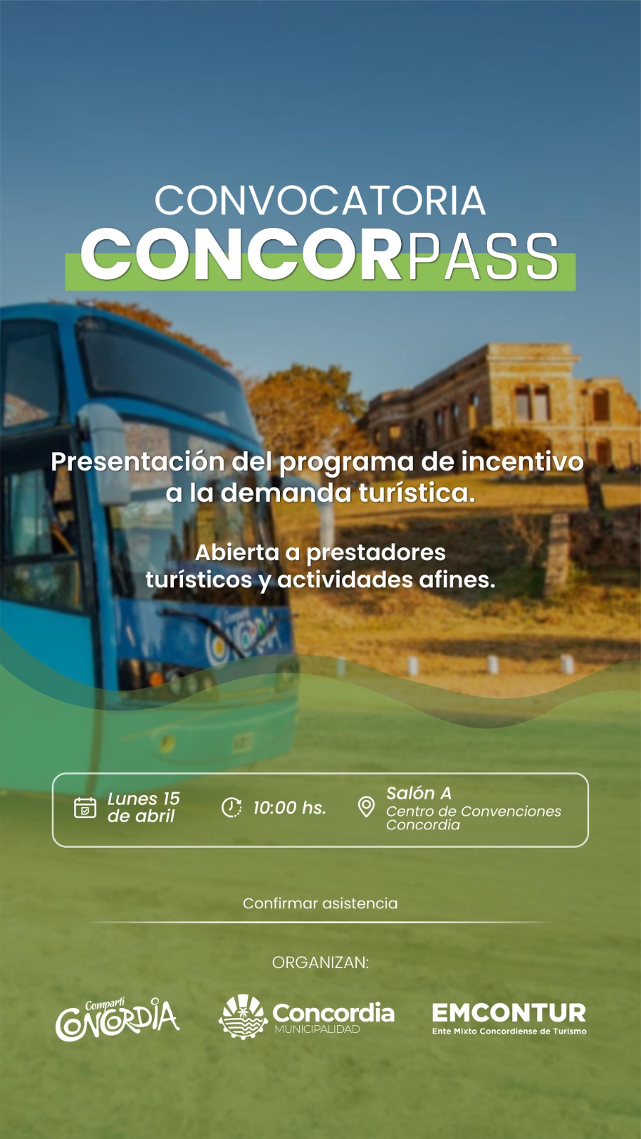 La Subsecretaría de Turismo y el Ente Mixto Concordiense de Turismo (EMCONTUR) están realizando una convocatoria abierta para prestadores turísticos, actividades afines e interesados en participar a una reunión informativa sobre el programa “ConcorPass”.