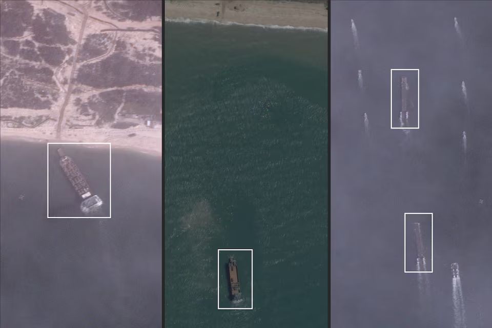 La primera imagen satelital a las 8:41 a. m. muestra dónde los segmentos del muelle flotante de 75 metros se desplazan hacia la playa, a 1.5 km de distancia. La segunda imagen satelital a las 11:27 a. m. muestra tres segmentos del muelle flotante conectados a la playa. La tercera imagen satelital a las 12:04 p. m. muestra que el muelle flotante fue desmontado y los segmentos ya no son visibles en la playa