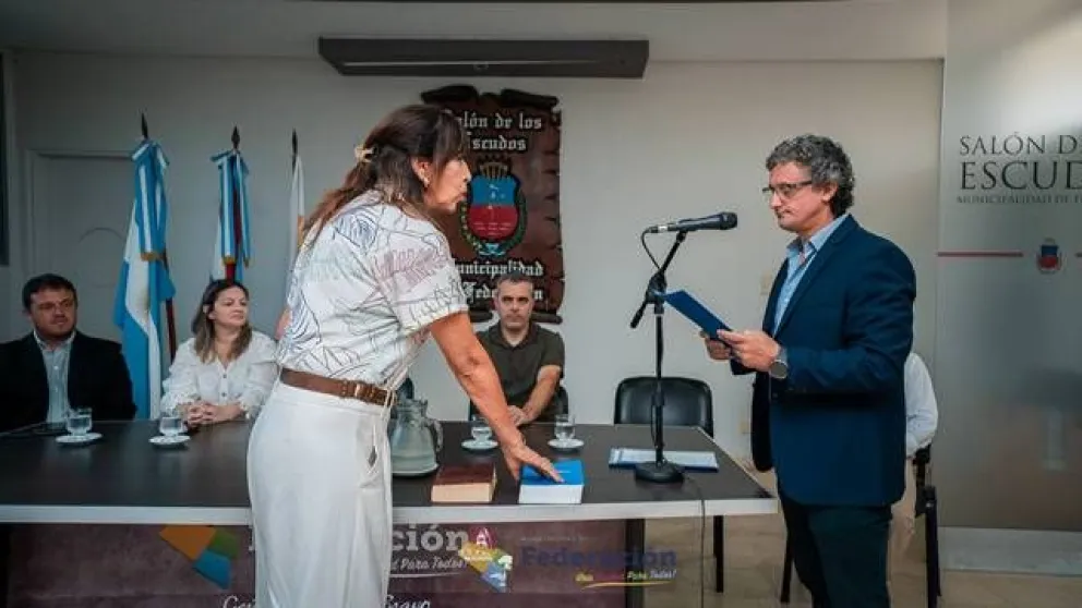 El intendente de Federación, Ricardo Bravo, encabezó el acto de jura y asunción de los nuevos secretarios que integrarán su Gabinete. Participaron del acto, la Vice Intendente Silvana Monzón, los integrantes del Gabinete Municipal, Concejales y familiares de los nuevos secretarios.