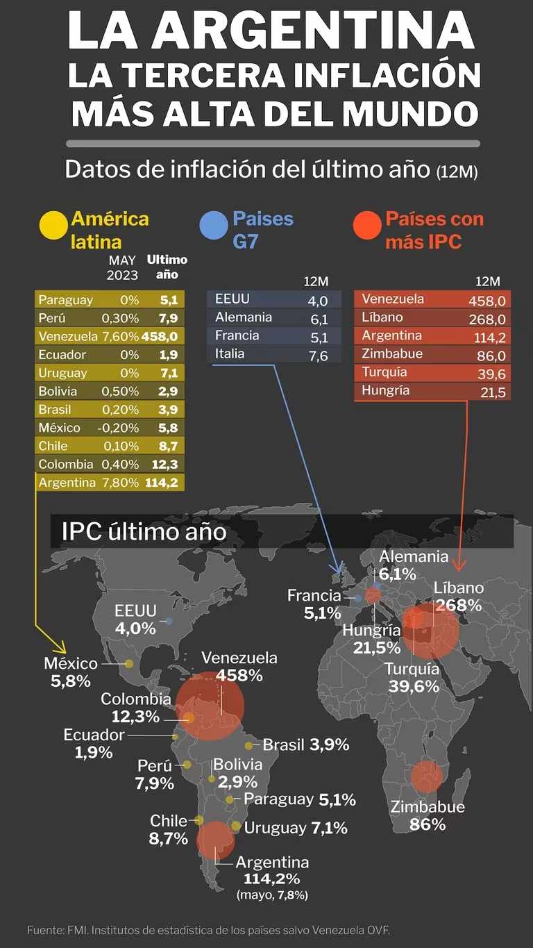 La Argentina ocupó en mayo el tercer lugar en el ranking mundial de inflación anual y el primero en el podio de la suba de precios mensual de América latina. Con el 7,8% informado por el Indec, el país superó el 7,6% registrado el mes pasado por el Observatorio Venezolano de Finanzas (OVF) en el país gobernado por Nicolás Maduro. El resto de la región tuvo una inflación menor al 1% en un mes.