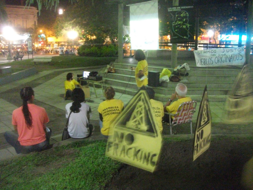 DSCF7120La Asamblea Ciudadana Concordia celebró anoche su segundo año de vida con un acto en el gazebo de la plaza 25 de Mayo. Difundieron un documento en el que definieron como objetivo fundacional de la Asamblea “obtener de los legisladores de nuestra provincia una ley que la proteja de la explotación petrolera. Este objetivo está aún pendiente, encriptado en el silencio y la indiferencia, lo mismo que obtenemos del Concejo Deliberante de Concordia cuando en reiteradas oportunidades trabajamos para solicitar la sanción de una ordenanza que declare al Municipio libre de fracking (fractura hidráulica)”.
