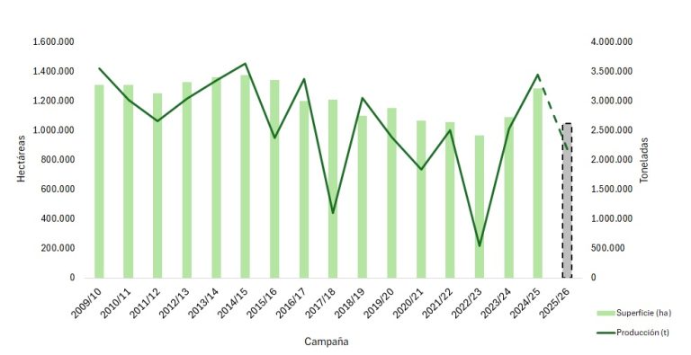 En síntesis, sobre una superficie total estimada de 1.050.000 hectáreas, se proyecta un rendimiento promedio de 2.086 kg/ha y una producción total de 2.190.000 t con una merma interanual del 36%.