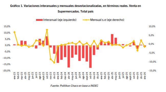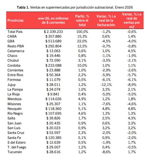 De acuerdo con la Encuesta de Supermercados del INDEC, las ventas a nivel nacional durante el mes de enero de 2026 totalizaron $ 2,34 billones, registrando así una caída real del 1,2% interanual; además, la evolución mensual desestacionalizada también presentó contracciones: respecto a diciembre 2025, las ventas mostraron una baja de 1,5%.