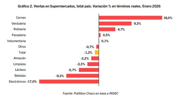 Sobre un total de once rubros que conforman la Encuesta de Supermercados, cinco presentaron incrementos reales interanuales en el primer mes del 2026: Carnes (18,0%), Verduras y Frutas (9,3%), Alimentos preparados y Rotisería (4,7%), Panadería (0,5%) e Indumentaria (0,1%). Estos cinco rubros explicaron el 26% de la facturación total del mes.