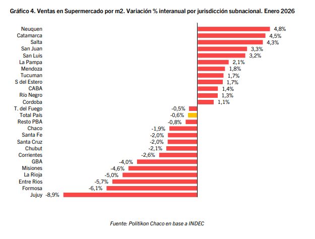 En cambio, en Tierra del Fuego (de +0,4% a -0,5%) y Santa Fe (de +0,9% a -2,0%) se da lo opuesto: crece la facturación total pero cae la venta por m2, por el efecto contrario: crecimiento de bocas de venta relevadas.