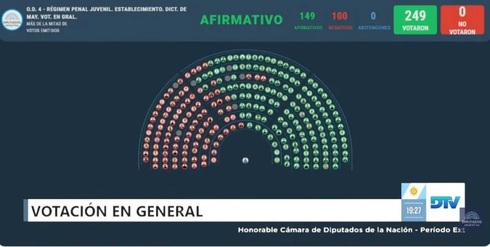 La Cámara de Diputados logró la media sanción al proyecto del Régimen Penal Juvenil, propuesto por el Gobierno nacional, con 149 votos a favor contra 100 legisladores que votaron en contra. No hubo abstenciones.