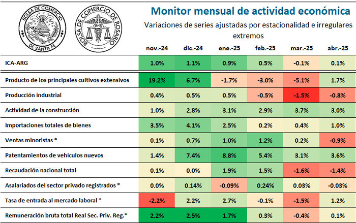 El producto de los principales cultivos extensivos volvió a crecer en abril con una variación mensual del 1,7%, gracias al avance de la cosecha de la campaña gruesa (soja, maíz, etc.). En la comparación con abril de 2024, en cambio, se observa una merma del 5,7%, que se explica principalmente por las recurrentes lluvias del mes. En lo que sigue, deberá evaluarse el impacto sobre los cultivos de las inundaciones en el norte de la provincia de Buenos Aires ocurridas a mediados de mayo.