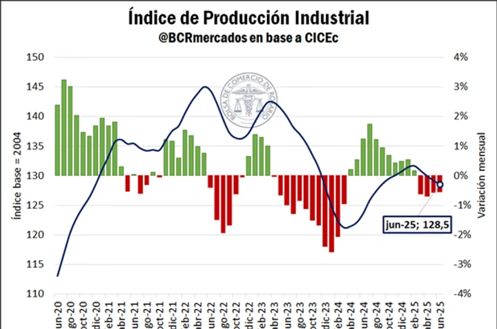 Tomando como referencia el Índice de Producción Industrial (IPI) elaborado por el Centro de Investigación del Ciclo Económico (CICEc) en base a datos del Instituto Nacional de Estadística y Censos (INDEC) y de la Fundación de Investigaciones Económicas Latinoamericanas (FIEL), se advierte que el sector industrial registró variaciones mensuales positivas entre abril de 2024 y febrero del año en curso, acumulando una recuperación del 9% durante aquel período. A partir de marzo, no obstante, el sector ha mostrado dificultades en mantener la tendencia creciente, registrando cuatro variaciones mensuales negativas consecutivas.