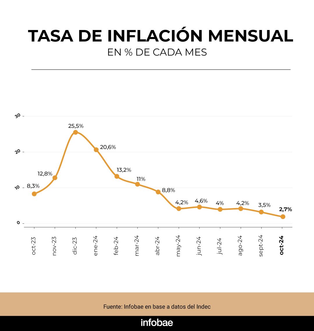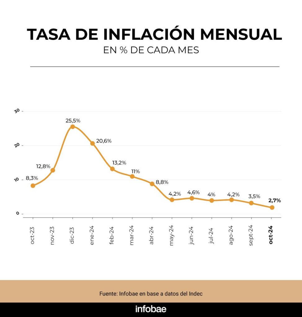 El Instituto Nacional de Estadística y Censos (Indec) informó que la inflación de octubre se ubicó en el 2,7%, lo que significa una nueva desaceleración en el índice de precios al consumidor en relación con el 3,5% registrado en septiembre. De esta manera, el incremento de precios acumulado en los últimos doce meses alcanzó el 193%, según el organismo oficial. Ese dato interanual es el sexto consecutivo en baja desde el 289,3% que se registró en abril pasado.