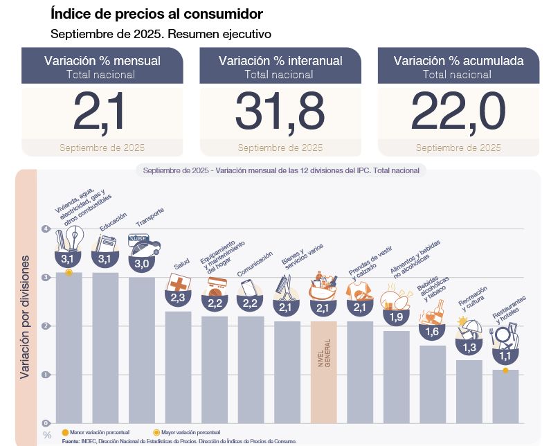 En un mes marcado por las elecciones legislativas de la provincia de Buenos Aires que convulsionó el mercado y generó una depreciación del peso, la inflación de septiembre superó el umbral del 2% por primera vez desde abril y se ubicó en el 2,1%, en línea con la expectativa del mercado, según informó el Instituto Nacional de Estadística y Censos (INDEC). El índice de precios al consumidor (IPC) acumuló un 22% en los primeros nueve meses del año y la variación interanual se desaceleró al 31,8%.