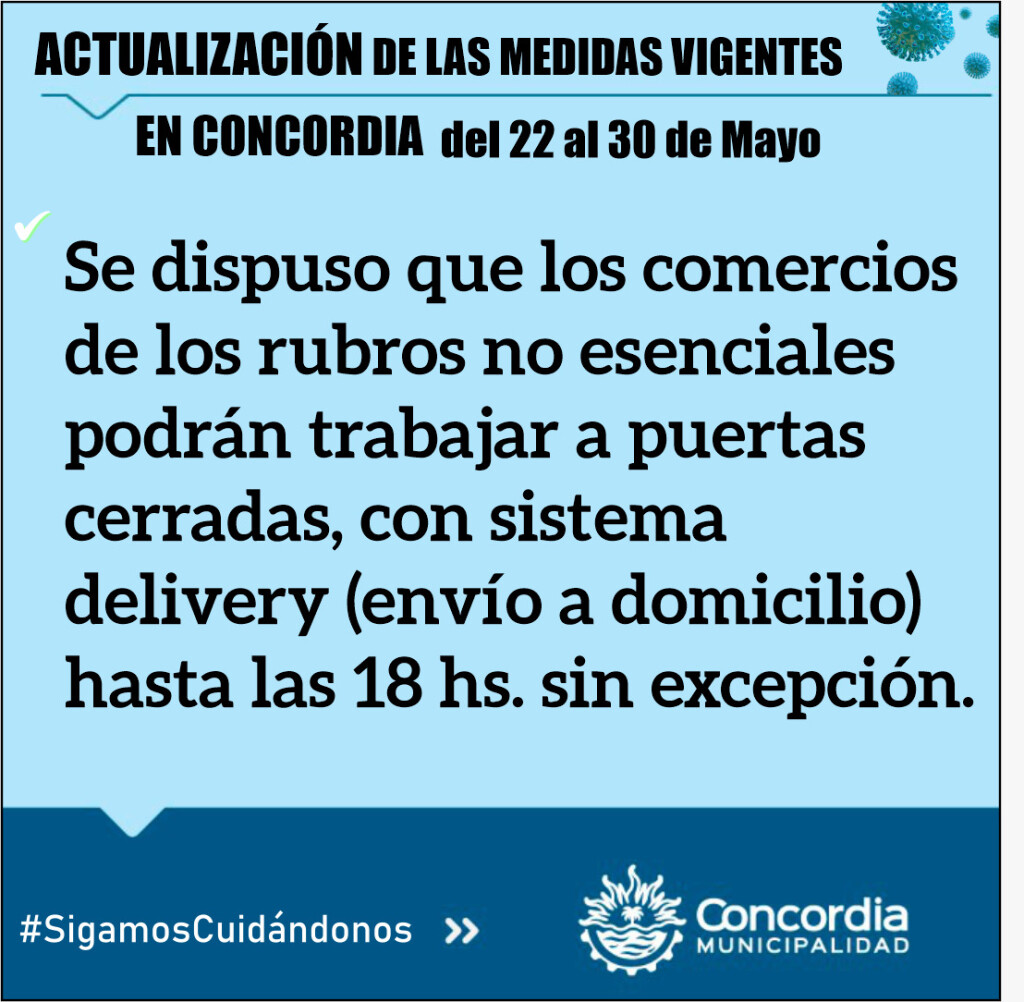 actualizacion quedaLa Municipalidad de Concordia informó que se actualizaron las disposiciones respecto a las restricciones vigentes hasta el 30 de mayo.