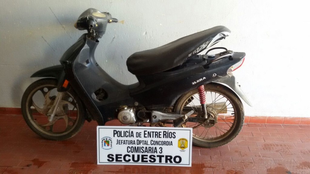 En otro procedimiento efectuado por funcionarios de Comisaría Tercera intervinieron en avenida Chajari al 2000 de esta ciudad, a raíz de un llamado anónimo dando cuenta de una moto en estado de abandono. Una vez en el lugar se procedió al secuestro de una motocicleta marca Gilera Smash, color negra sin dominio colocado. La misma presentaba pedido de secuestro de fecha 18/03/2016 por denuncia radicada en Comisaría 7º.