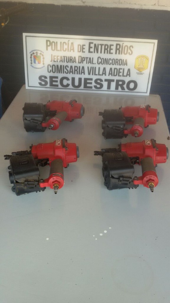 Ayer a las 7:30 se presentó en la comisaria de Villa Adela el apoderado de la firma Media Vuelta SRL, que se dedica a la fabricación de pallet de madera en calle Capitán Rojas de la zona rural de Villa Adela manifestando que aproximadamente a las cinco de la mañana un masculino al cual conoce por el apodo, que vive en la calle Kloster, engañó al sereno (un hombre mayor de edad) y logró ingresar al predio de la fábrica y con el conocimiento que obtuvo tras haber trabajado hace un tiempo en el lugar, fue directamente a una habitación en donde guardan las herramientas de trabajo y sustrajo 4 clavadoras neumáticas, también llamadas pistolas de clavos, marca «Senco», de color rojo en buen estado de conservación, que cuestan alrededor de 8.000 pesos cada una. Los funcionarios iniciaron las tareas investigativas, por la zona donde vive el autor del hecho, calle Kloster entre Tratado del Pilar y Anacleto Medina. En la vivienda no había moradores.