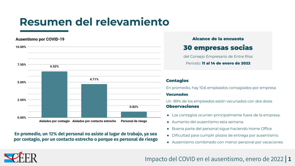 Un 12% de los trabajadores no acudió a su puesto de trabajo en la segunda semana de enero debido a causas vinculadas con el COVID-19, según un relevamiento realizado entre las empresas socias del Consejo Empresario de Entre Ríos (CEER). Un 6,5% estuvo de licencia por haber contraído la enfermedad, un 4,7% estuvo aislado por contacto estrecho y un 0,8% no fue a trabajar por ser de personal de riesgo. «Un 12% de ausentismo es un número alto y la expectativa es que siga aumentando en las próximas semanas», señaló Héctor Fratoni, presidente del CEER.