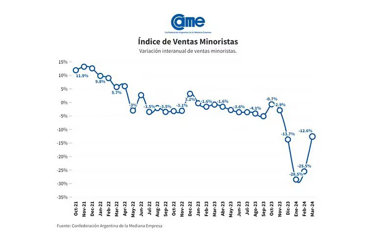 Las ventas minoristas pymes cayeron 12,6% interanual en marzo y acumulan una caída de 22,1% en el primer trimestre del año. En la comparación mensual, disminuyeron 3,2%, según la Confederación Argentina de la Mediana Empresa (CAME).