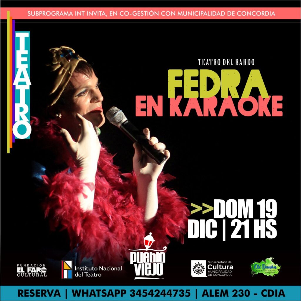 ¡¡Cerramos el año con broche de oro!!  El Domingo 19 se presenta en nuestra sala la obra  «FEDRA EN KARAOKE»  del grupo Paranaense «Teatro del Bardo», obra que hace parte del Catálogo del INT y llega a Concordia en el marco del Programa «INT Invita» en cogestión con la Municipalidad de Concordia.