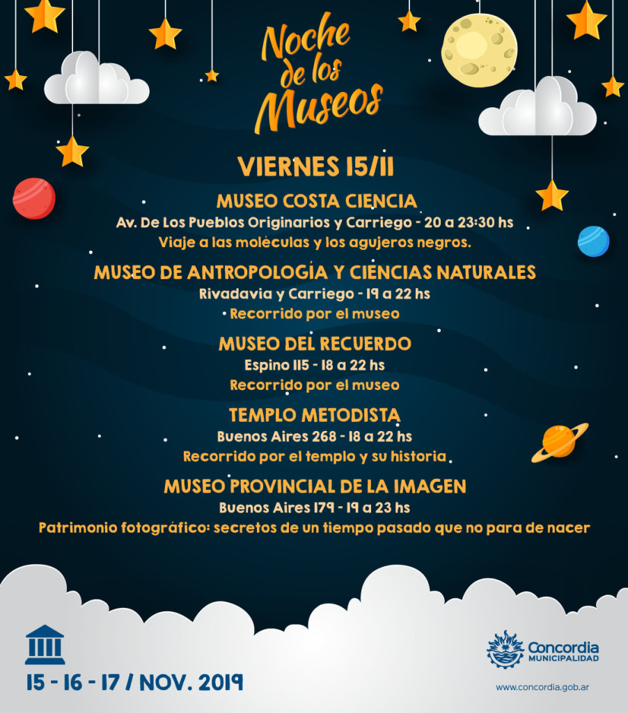 El viernes 15, en el primer día, se podrá visitar el Museo de Antropología y Ciencias Naturales (Rivadavia y Carriego) en el horario de 19 a 22 hs; el Museo Costa Ciencia de la Costanera, de 20 a 23.30 hs, que ofrecerá distintas propuestas; el Museo del Recuerdo, en calle Espino 115, de 18 a 22 hs; el Templo Metodista, en calle Buenos Aires 268, en el mismo horario; y el Museo Provincial de la Imagen, en Buenos Aires 179 (ex Barraca Americana), en el horario de 19 a 23 hs.