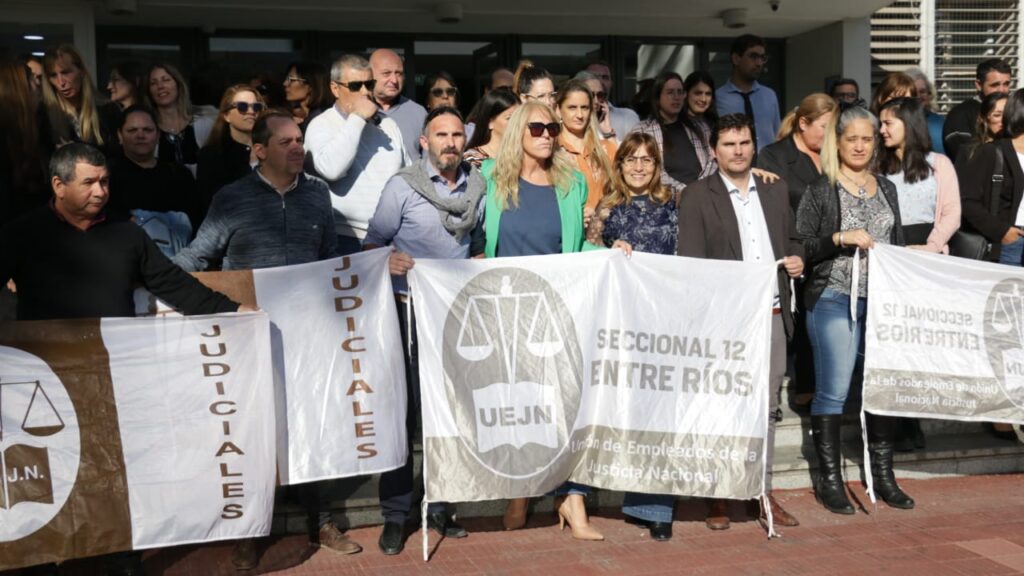 En la mañana del miércoles un grupo de trabajadores nucleados en la Unión de Empleados de la Justicia de la Nación (UEJN) se manifestaron para exigir mejoras salariales: En Paraná se reunieron en la puerta de Tribunales.