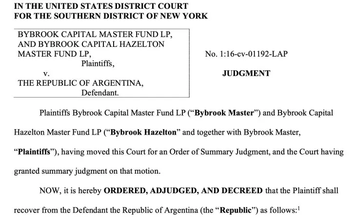 En las últimas horas se conoció el fallo en el que Preska manifiesta que «los demandantes Bybrook Capital Master Fund LP («Bybrook Master») y Bybrook Capital Hazelton Master Fund LP («Bybrook Hazelton» y, junto con Bybrook Master, los «demandantes»), solicitaron a este Tribunal una orden de sentencia sumaria, y el Tribunal concedió sentencia sumaria sobre dicha moción».