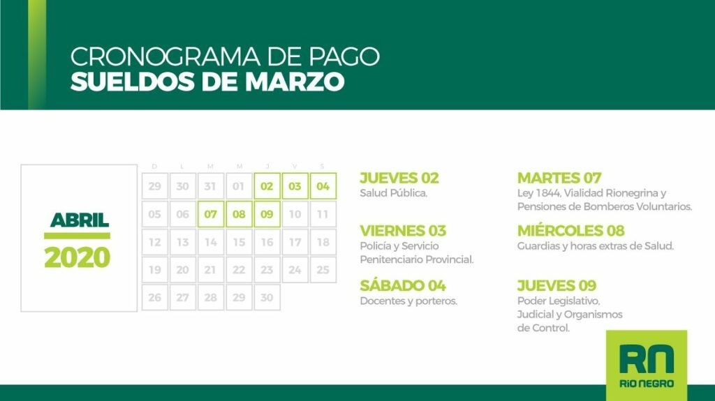 Este viernes cobrarán quienes perciben hasta 25.000 pesos. El martes 5 de mayo aquellos sueldos comprendidos entre 25.001 pesos a 35.000 pesos, el miércoles 6 de mayo de 35.001 pesos a 45.000 pesos, el jueves de de 45.001 pesos a 55.000 pesos y el viernes 8 de mayo los que perciben desde 55.001 hasta 75.000 pesos.