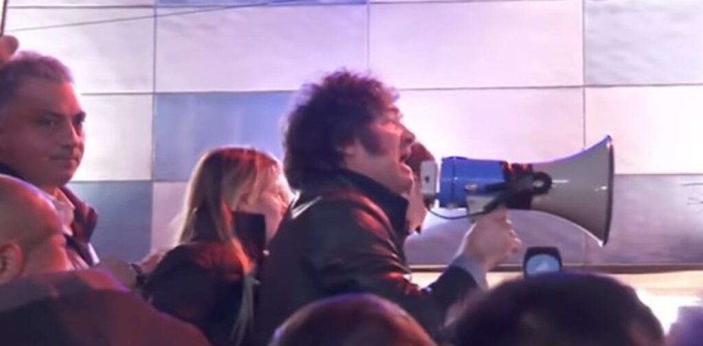 Durante su breve discurso con un megáfono y arriba de una camioneta, Javier Milei le pidió a la gente que acompañe a los candidatos de La Libertad Avanza (LLA) en las elecciones del 26 de octubre y reiteró que para el año próximo su Gobierno va a «eliminar la inflación».