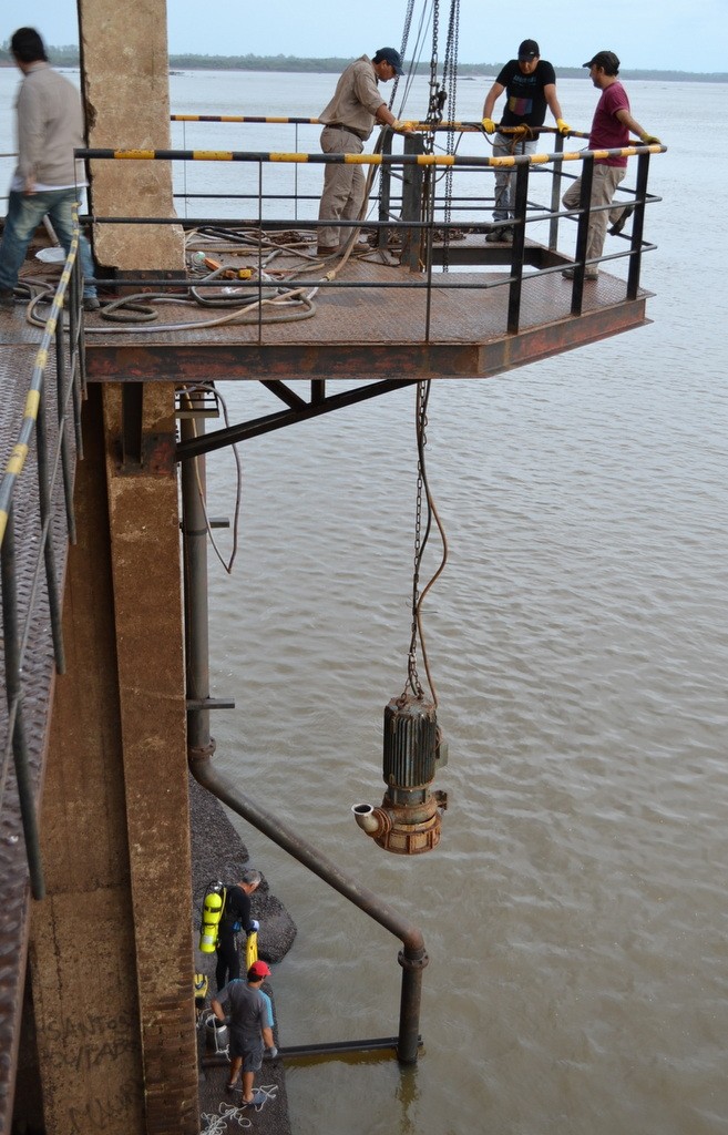 Allí, un buzo y los trabajadores del EDOS procedieron a la instalación de la sexta bomba de captación del sistema de la Planta Potabilizadaora, quedando en funcionamiento, lo que permitirá mejorar la presión de agua en la red.