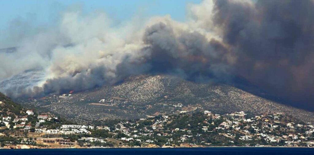 En Kouvaras, al este de Atenas, un incendió arrasó la zona y llegó a otra localidad situada a unos 40 km al sureste de la capital.