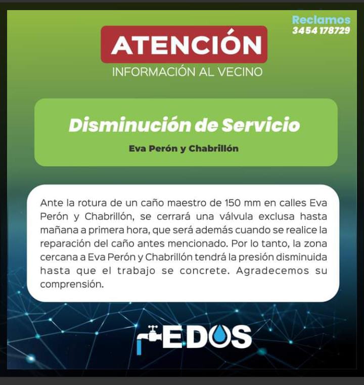 “La zona cercana a Eva Perón y Chabrillón tendrá la presión disminuida hasta que el trabajo se concrete. Agradecemos su compresión”, indicaron luego.