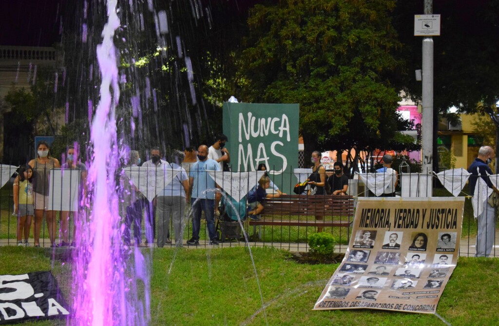 “Hoy nos reunimos de nuevo en nuestra plaza, respetando los protocolos de prevención; pero con la misma fortaleza y sentimiento de siempre”, señaló José Salazar, de HIJOS Concordia. “Porque el reclamo de Memoria, Verdad y Justicia sigue vigente y se fortalece aún más con el paso del tiempo. Es una lucha que nunca vamos a abandonar”, agregó.