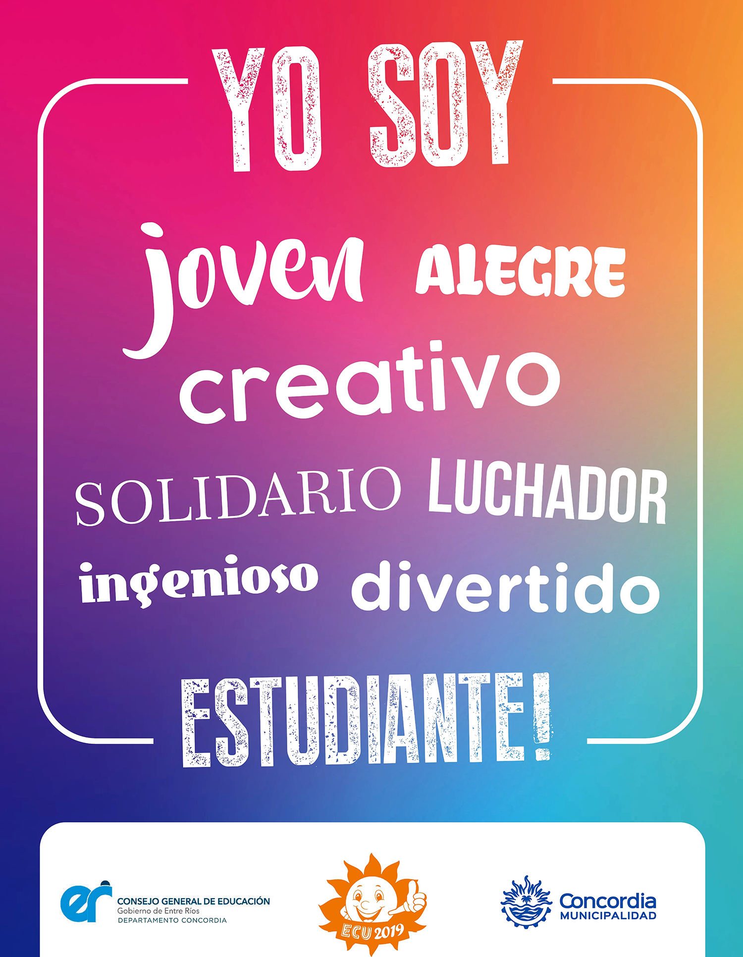La Municipalidad de Concordia junto a la Dirección Departamental de Escuelas convoca a los estudiantes a participar de la Jornada “Yo Soy”, en la que se realizarán diversos talleres con el fin de brindar orientación ante temas de interés. Y como cierre del encuentro, se realizará un concurso de preguntas y respuestas con importantes premios en órdenes de compra que los estudiantes podrán destinar a sus carrozas.