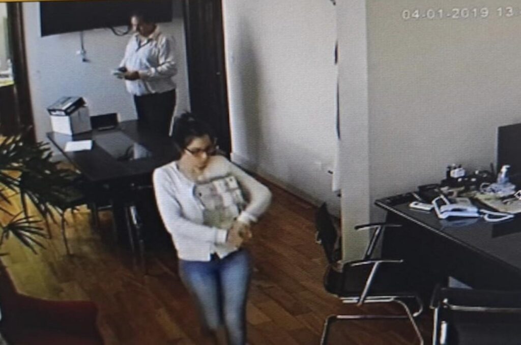 La otra mujer que aparece en las escenas, de anteojos, es Yamila Evelyn Camps, secretaria privada de Kueider. En el video se la puede ver caminando por el despacho, trasladando en sus brazos una cantidad de fajos de dinero.
