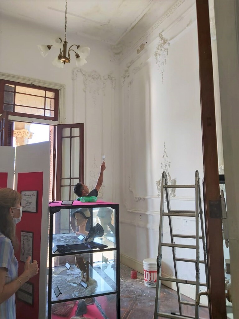 La Municipalidad inició trabajos de reacondicionamiento y puesta en valor del Museo Regional «Palacio Arruabarrena». Las tareas incluyen trabajos de mampostería, reparación de filtraciones y paredes, y restauración de ornamentaciones y esculturas, entre otros trabajos que se suman a las tareas diarias de mantenimiento que el personal del Museo realiza.