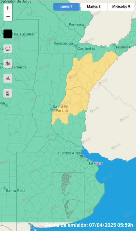 El Servicio Meteorológico Nacional emitió un alerta amarilla por lluvias y tormentas para gran parte del territorio provincial. Los departamentos afectados son La Paz, Federal, Feliciano, Federación, Concordia, San José, Paraná, Villaguay, Diamante, Nogoyá, Victoria y Gualeguay.