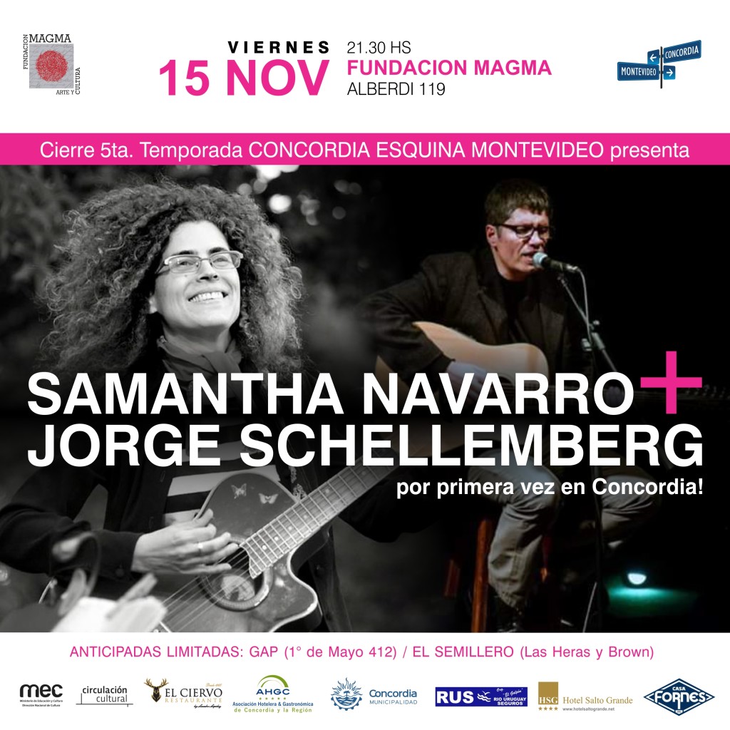 La temporada 2019 del ciclo “Concordia esquina Montevideo” presenta a los cantautores montevideanos Samantha Navarro y Jorge Schellemberg. El encuentro será el viernes 15 de noviembre, a las 21.30 hs, en el auditorio de Fundación Magma (Alberdi 119). Las entradas anticipadas están a la venta en El Semillero (Las Heras y Brown) y GAP (1º de Mayo 412).