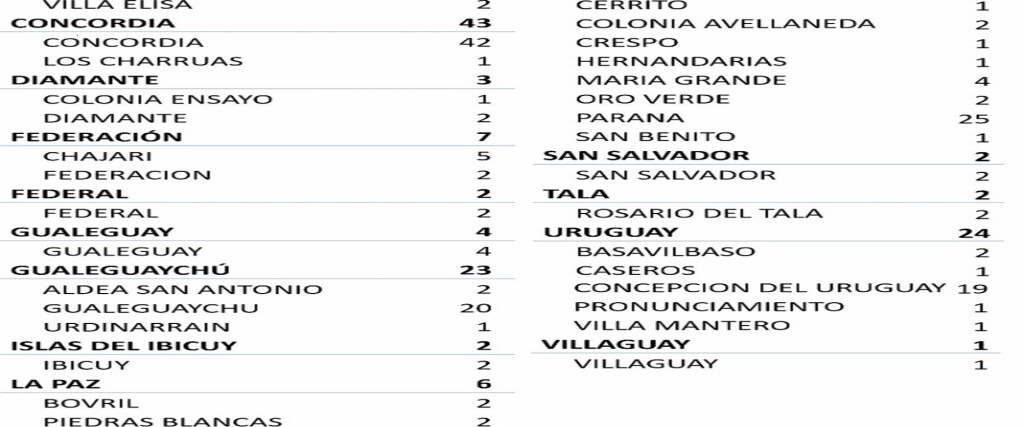 Departamento Paraná 37, Departamento Colón 22, Departamento Concordia 43, Departamento Diamante 3, Departamento Federación 7, Departamento Federal 2, Departamento Gualeguay 4, Departamento Gualeguaychú 23, Departamento Islas del Ibicuy 2, Departamento La Paz 6, Departamento Nogoyá 1, Departamento San Salvador 2, Departamento Tala 2, Departamento Uruguay 24, Departamento Villaguay 1. De ese modo, en la provincia son 44.933 los confirmados.