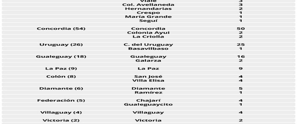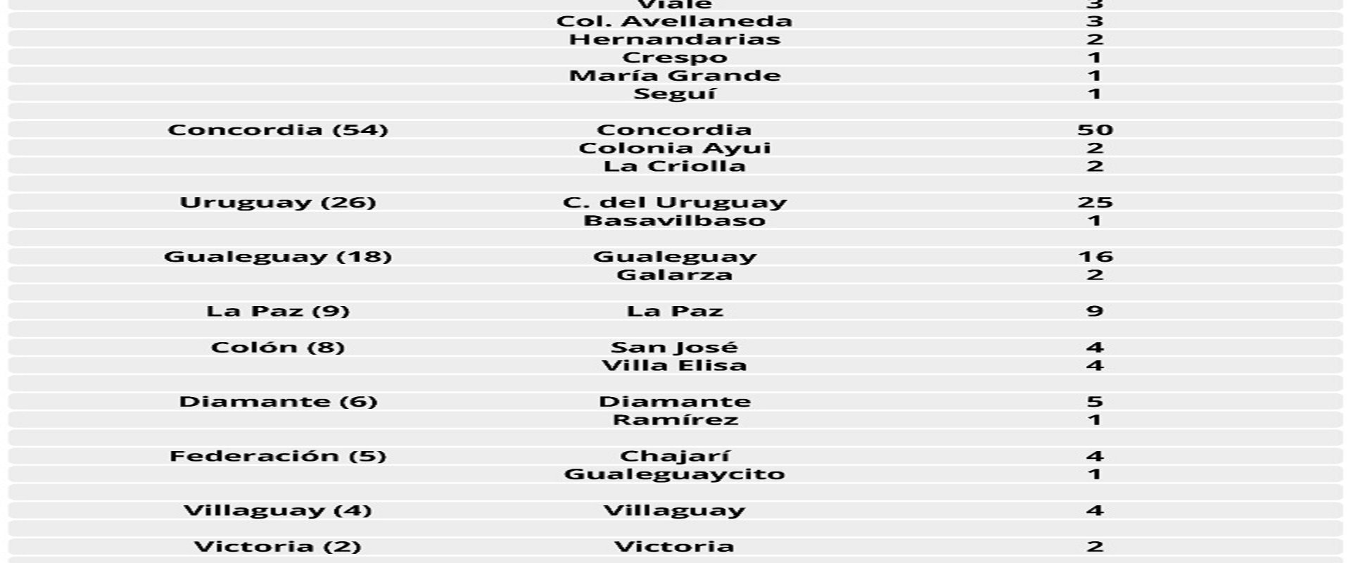 Departamento Paraná 55, Departamento Colón 8, Departamento Concordia 54, Departamento Diamante 6, Departamento Federación 5, Departamento Gualeguay 18, Departamento Gualeguaychú 70, Departamento Islas 2, Departamento La Paz 9, Departamento San Salvador 1, Departamento Uruguay 26, Departamento Victoria 2, Departamento Villaguay 4.